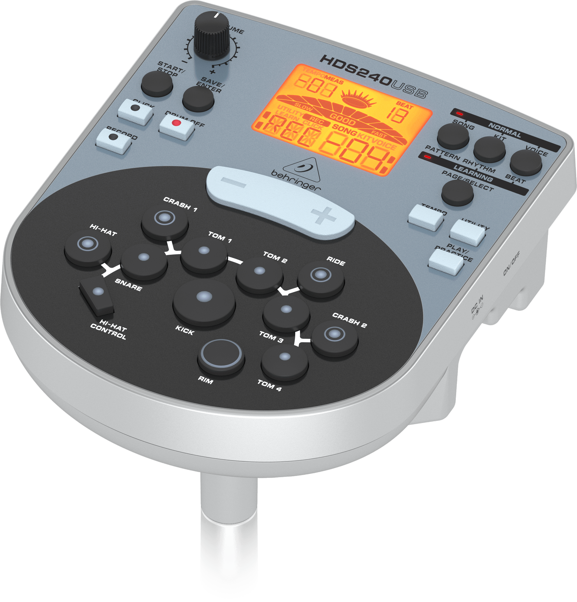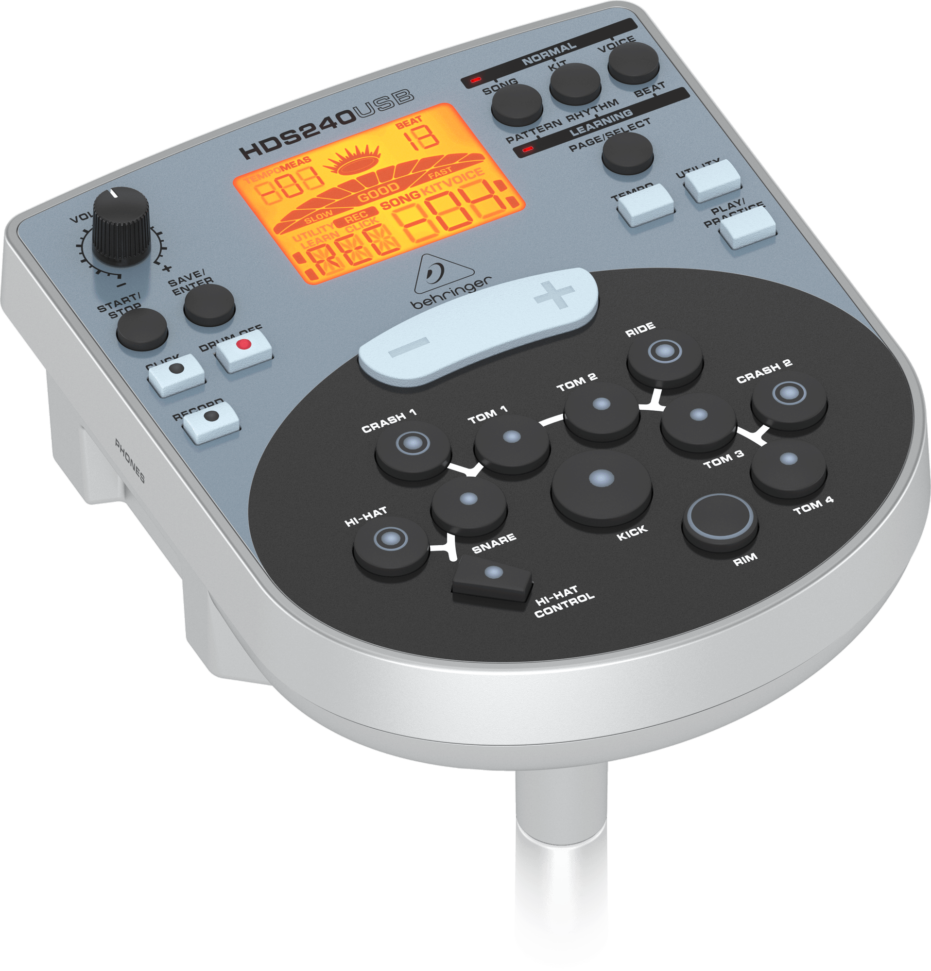 - Includes: HDS240USB sound module, Kick pedal, pad and stand, 1 x 8″ dual-zone snare pad, 3 x 8″ dual-zone pads, 3 x 12″ cymbals, Hi-hat trigger pedal, Drum rack with mounting hardware, Multi-pin breakout cable for easy setup, Pair of drumsticks, Drum tool, Quick start guide and assembly instructions