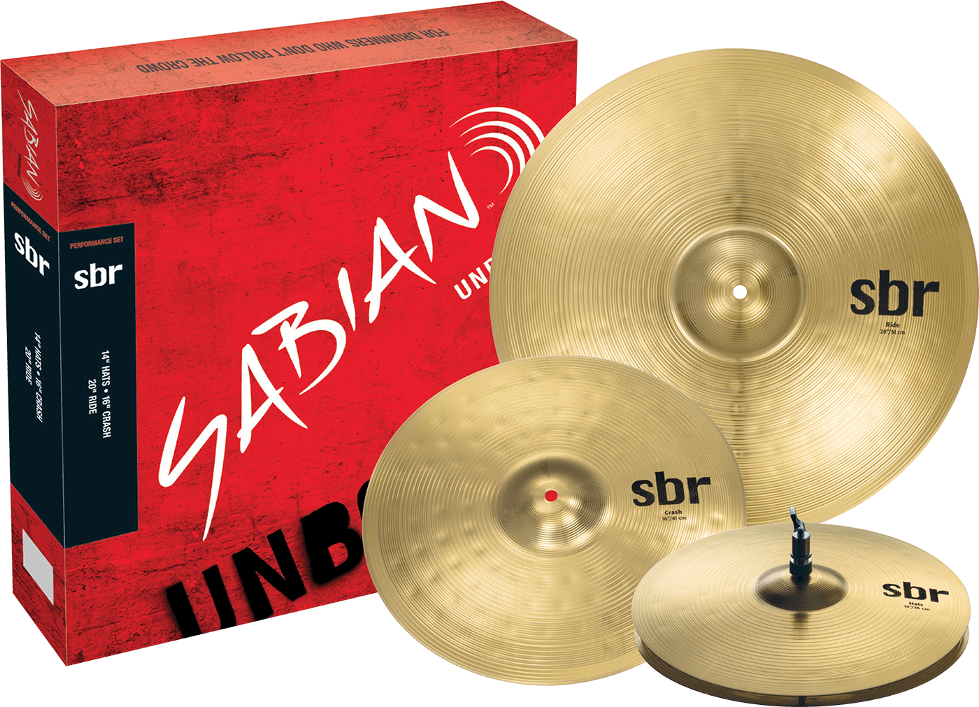 14” SBr Hats produce tight, clean sounds when closed, and loud fullness when open. Partially open, attack them with your stick shoulder for effective crisp, thick tone – with none of the tinny sounds typically found at this price point. Switch to an opened-closed jazz rhythm and they sound authentic and breezy. The body is always substantial and steady, and closed eighth-note patterns remain dense sounding – never thin. A 16” Crash yields similar pleasing results. Powered by pure Sabian Brass, it’s a loud punchy model, ideal for accents. The decay is fairly rapid, with more than enough sustain for proper wash-ride patterns. Delivering full-sounding ride patterns, the 20” SBr Ride offers unmatched versatility at this price point. The medium weight and classic profile of this popular model lends it instant credibility. The decay is fast so you can wash-ride it with confidence if needed, and the bell has a powerful sound – not unlike a much more expensive bronze bell. Stick response is clean and the sound is always lively.