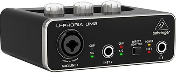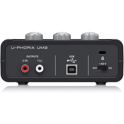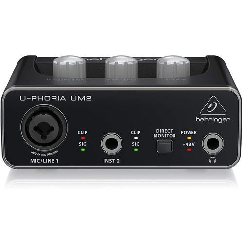 The Behringer U-Phoria UM2 USB Audio Interface features a Xenyx mic preamp and combination XLR/TRS inputs, the Behringer UM2 delivers audiophile performance with outstanding versatility and professional audio quality. Complete with a rich feature-set, powerful monitoring outputs and compatibility with both Mac and PC.