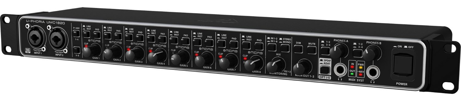 The Behringer U-Phoria UMC 1820 is a USB/MIDI interface designed to let users create and edit their music with ease. Users can connect microphones, guitars, keyboards and many other instruments as well as MIDI devices. There are eight high-quality MIDAS preamps that deliver incredibly clear sounds and even include +48V phantom power for use with condenser microphones.